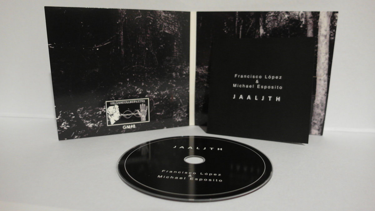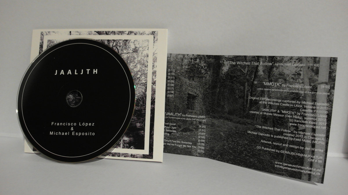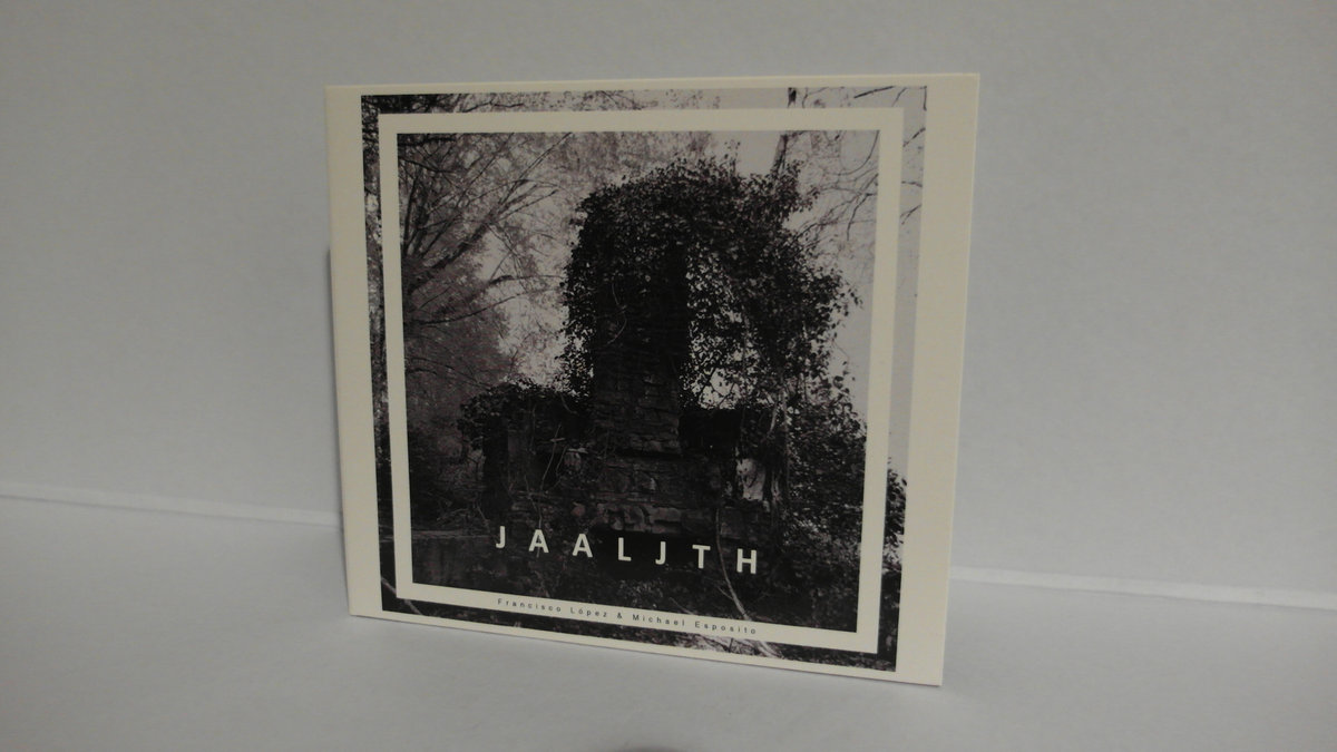 By now the name Michael Esposito should be connected, straight away, with EVP, the electronic voice phenomena, also known as voices from beyond. I recently received some of these from him, the raw data, and it sounds very much like the eight short pieces that open up 'Jaaljth', his collaborative work with Francisco Lopez, and judging by the titles they are the same. This is followed by eight processed pieces by Lopez, called 'Jaaljth', although individual pieces refer to the original sources, then a piece by Esposito, which is much longer than the source pieces and an even longer processed version thereof. Multiple pieces! That seems to be a rare thing in the CD world of Lopez (but it happens!). It's not easy to follow the routes he takes into the source material and detect any of that in these pieces. It's however great to hear him operate in a short time frame for this pieces. Once he goes all silent, in 'I'm Freezing', but in the other pieces we are able to follow the computer processing that takes place. More so than on his older work, it seems to me that Lopez is now extensively using computer technology (max/mps, pure data, audiomulch, who knows?) to transform what he calls sound matter. Time stretching plays an important role, and so does granular synthesis. Nice! In the longer Esposito piece there is more a balance between the original EVP recordings and what seems to be synthesizer/electronics/computer processing, which are gradually taking over the piece. Very nice. In the Lopez version of this, it gradually dies out in static crackles and marks a fine ending to a great release.